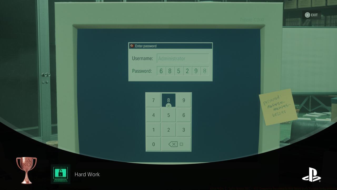 - Five password-protected computers contain crucial story details and unlock the Hard Work Trophy/Achievement