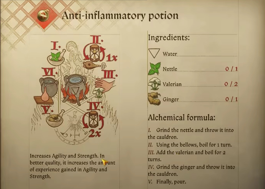 The Anti-inflammatory formula demands precise measurement of botanical components: specifically 1 Nettle, 2 Valerian roots, and 1 Ginger rhizome. When correctly prepared, this elixir delivers simultaneous improvements to both Strength and Agility attributes, making it particularly valuable for combat-oriented characters.