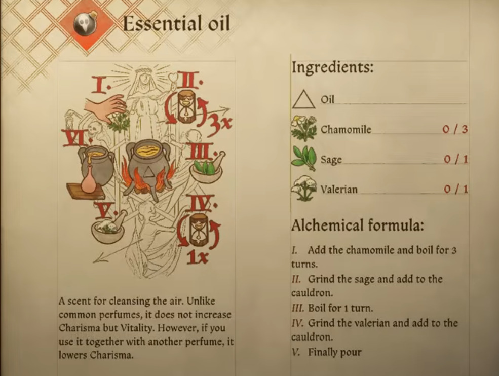 This aromatic preparation calls for 3 chamomile flowers, one valerian root, and one sage leaf. Unlike conventional perfumes that augment Charisma, this unique blend fortifies your Vitality statistic instead. Importantly, its effects cannot stack with other perfume items, requiring careful equipment planning.