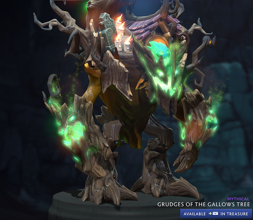 Pudge’s graveyard-themed set incorporates tombstone elements and spectral chains that rattle during hook animations. The design emphasizes his undead nature with visible bone structures beneath torn flesh.
