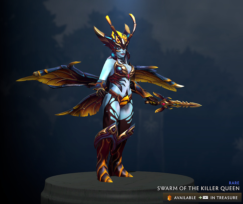 Swarm of the Killer Queen presents Queen of Pain as an insectoid monarch, with chitinous armor and wing structures that feature swarm particle effects during mobility spells.