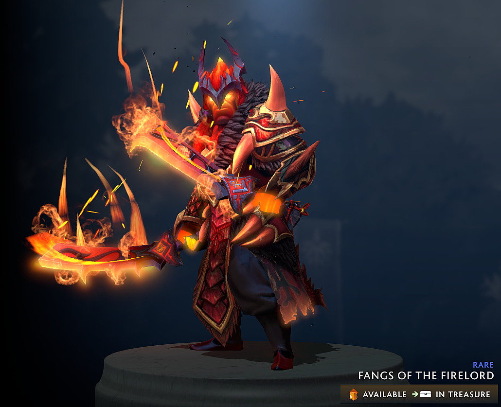 Fangs of the Firelord reimagines Ember Spirit as an elemental force of pure combustion, with flame-wreathed armor that leaves shimmering heat trails during movement. The unique fire particle effects create distinctive visual signatures for each ability.