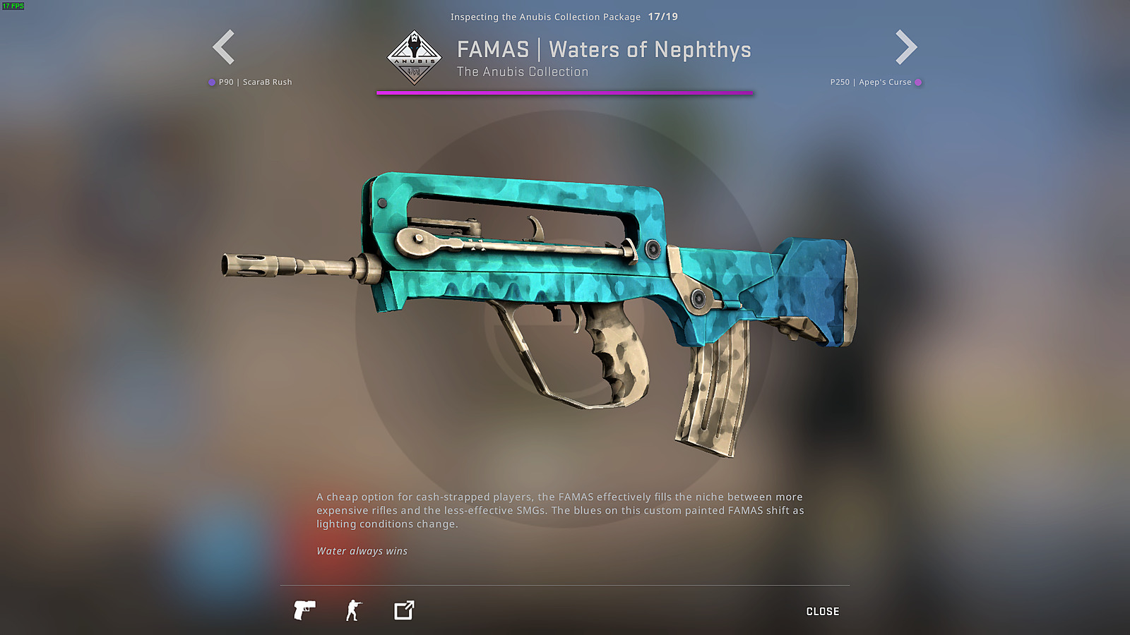 FAMAS Waters of Nephthys presents a flowing water theme honoring the goddess Nephthys with wave-like patterns and aquatic color shifts. This skin’s fluid dynamics representation showcases advanced texturing techniques within the collection.