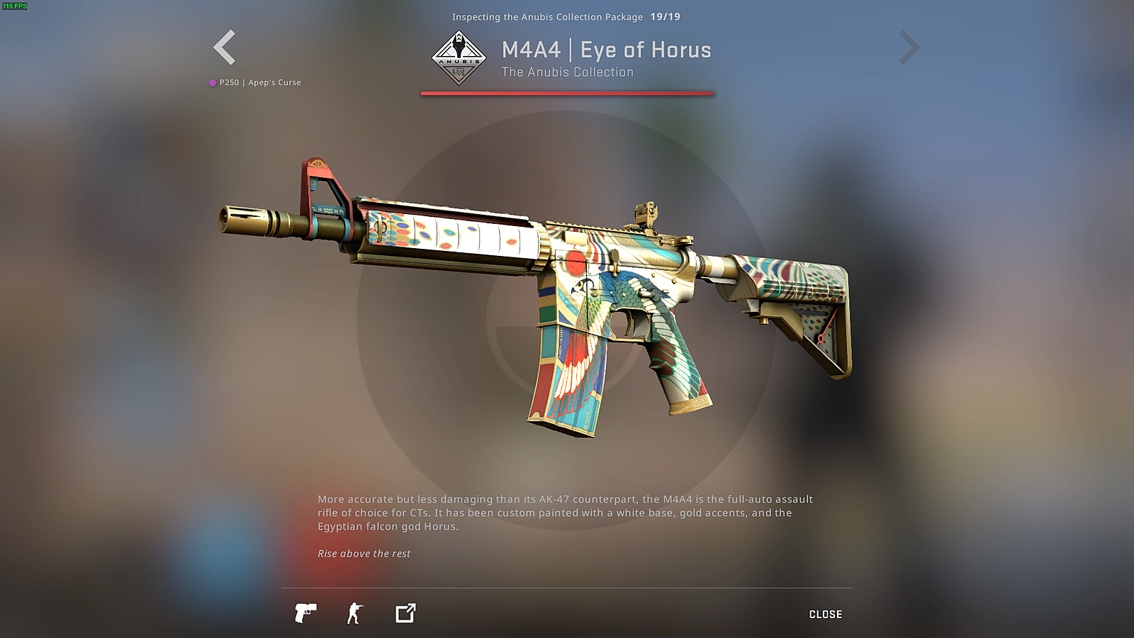 M4A4 Eye of Horus represents the collection’s crowning achievement with its magnificent golden Horus eye emblem dominating the weapon’s receiver. This skin’s premium execution and symbolic significance position it as the definitive investment piece within the Anubis Collection.