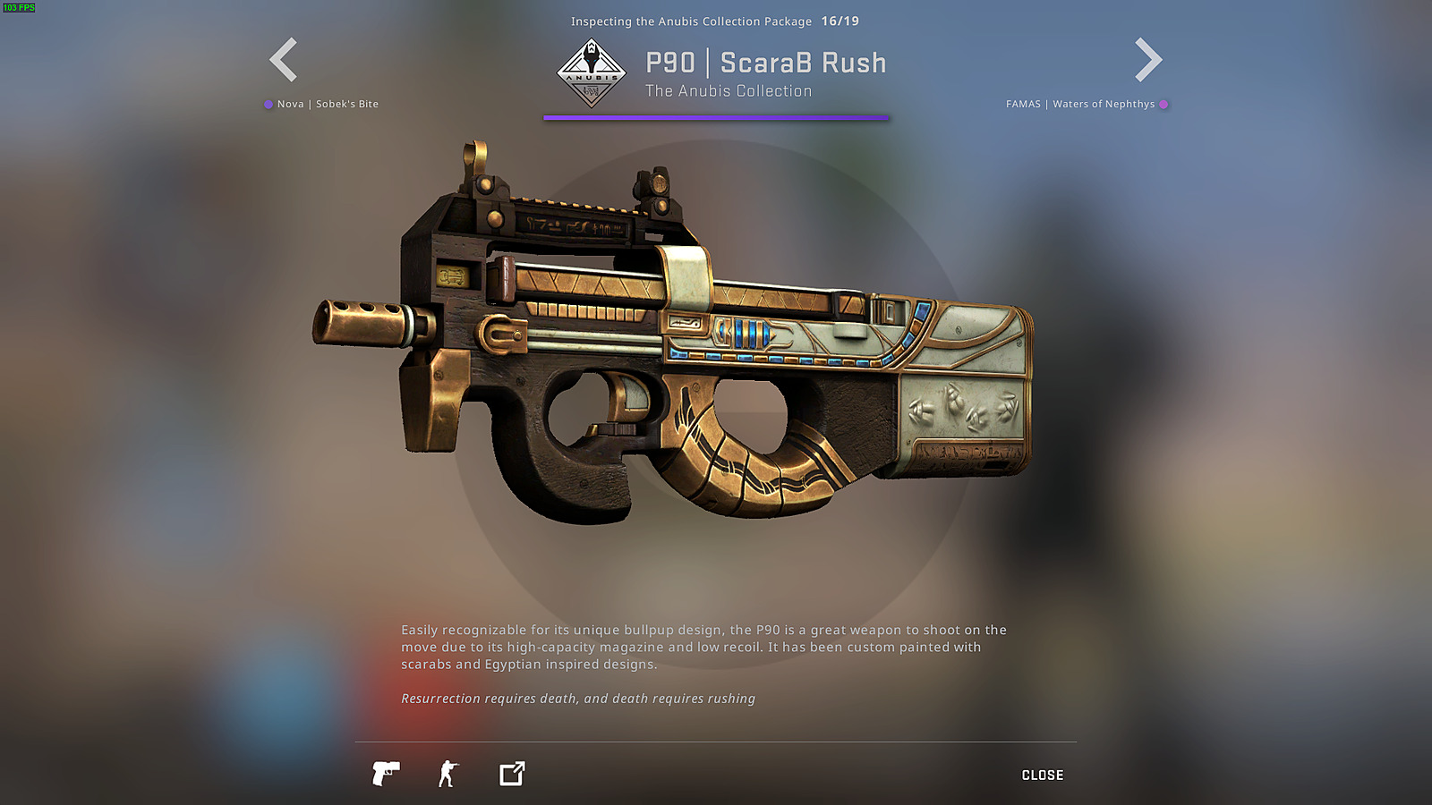 P90 ScaraB Rush utilizes the sacred scarab beetle motif throughout the weapon’s distinctive bullpup design. The skin’s insectoid elements create unique visual interest while maintaining the Egyptian thematic consistency.
