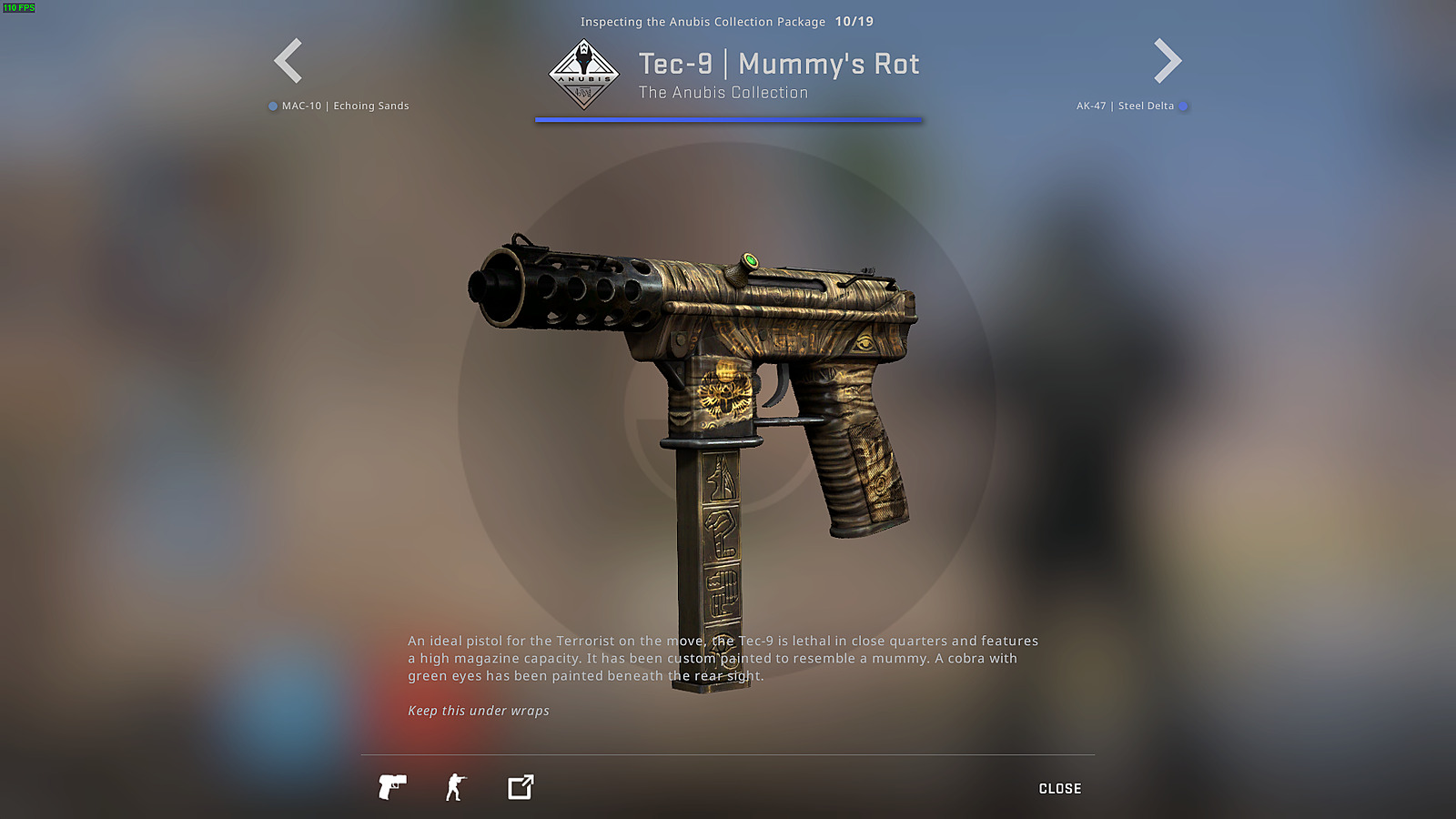 Tec-9 Mummy’s Rot employs a decaying bandage motif with exposed areas revealing ancient wood beneath. This skin’s horror-inspired elements provide unique thematic depth within the collection.