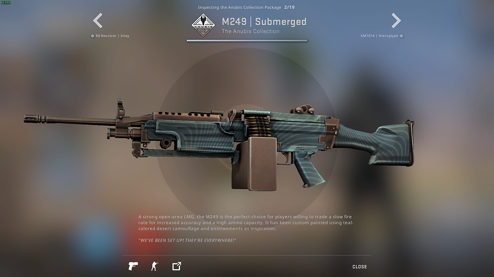 M249 Submerged presents a weathered aquatic theme reminiscent of artifacts recovered from Nile riverbeds. The design incorporates corrosion-like texturing with submerged hieroglyphics visible beneath a watery surface effect. This skin’s unique appeal lies in its textured appearance that suggests ancient underwater discovery.