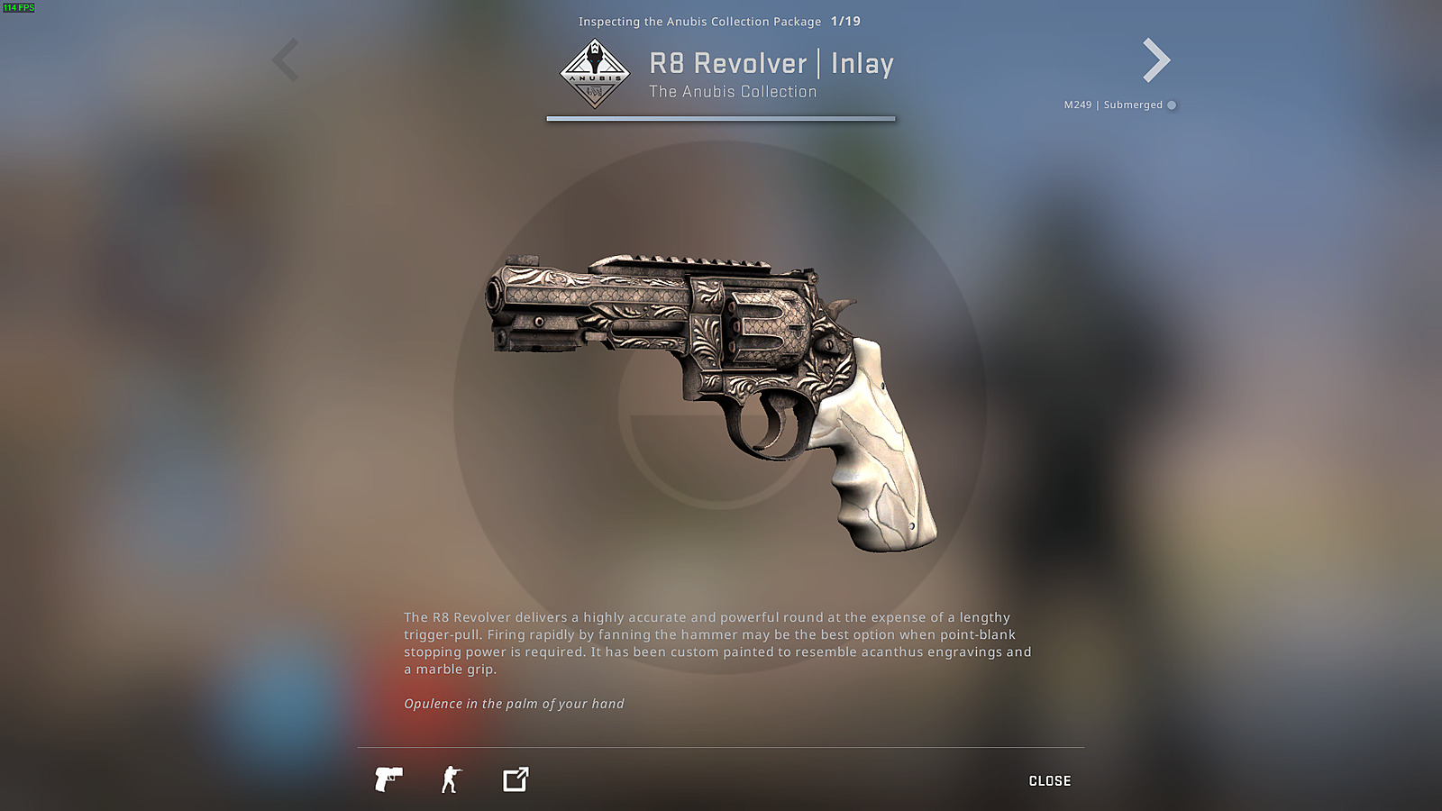 The R9 Revolver Inlay showcases intricate Egyptian patterning with gold accents against dark wood finishes. This skin transforms the revolver into a ceremonial artifact worthy of pharaohs, featuring hieroglyphic-inspired detailing that wraps around the cylinder and barrel. Collectors should note the subtle metallic sheen that shifts under different lighting conditions.