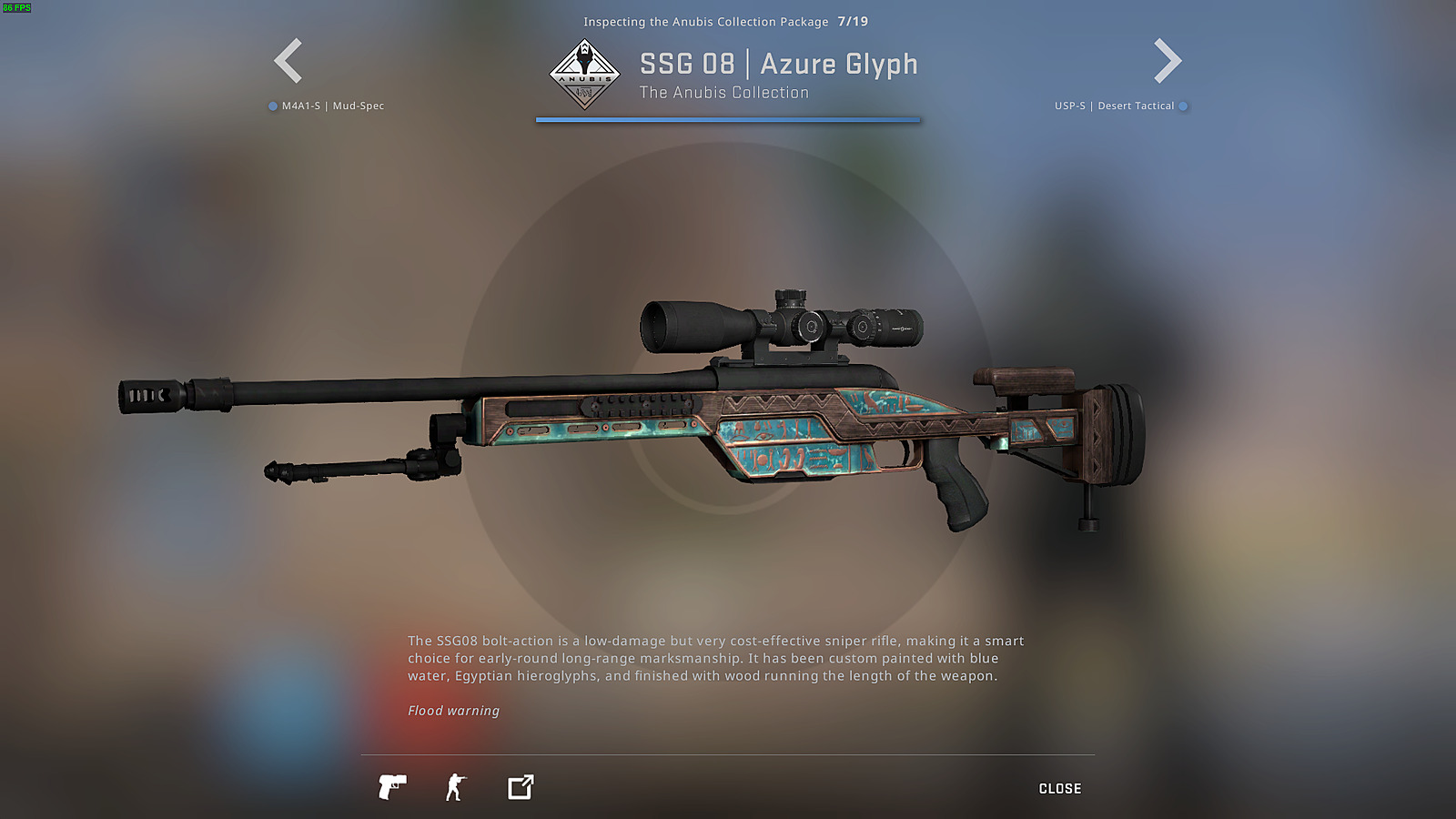 SSG 08 Azure Glyph combines brilliant blue accents with golden Egyptian symbols for striking visual contrast. This skin’s vibrant coloration makes it particularly desirable for players seeking high-visibility customization options.