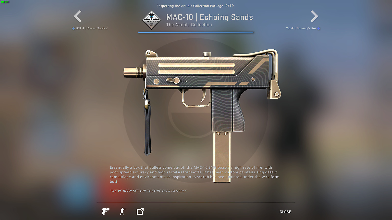 MAC-10 Echoing Sands features a wind-swept desert appearance with layered sand texture and fading edge details. The skin’s dynamic quality comes from its directional patterning that suggests movement and age.