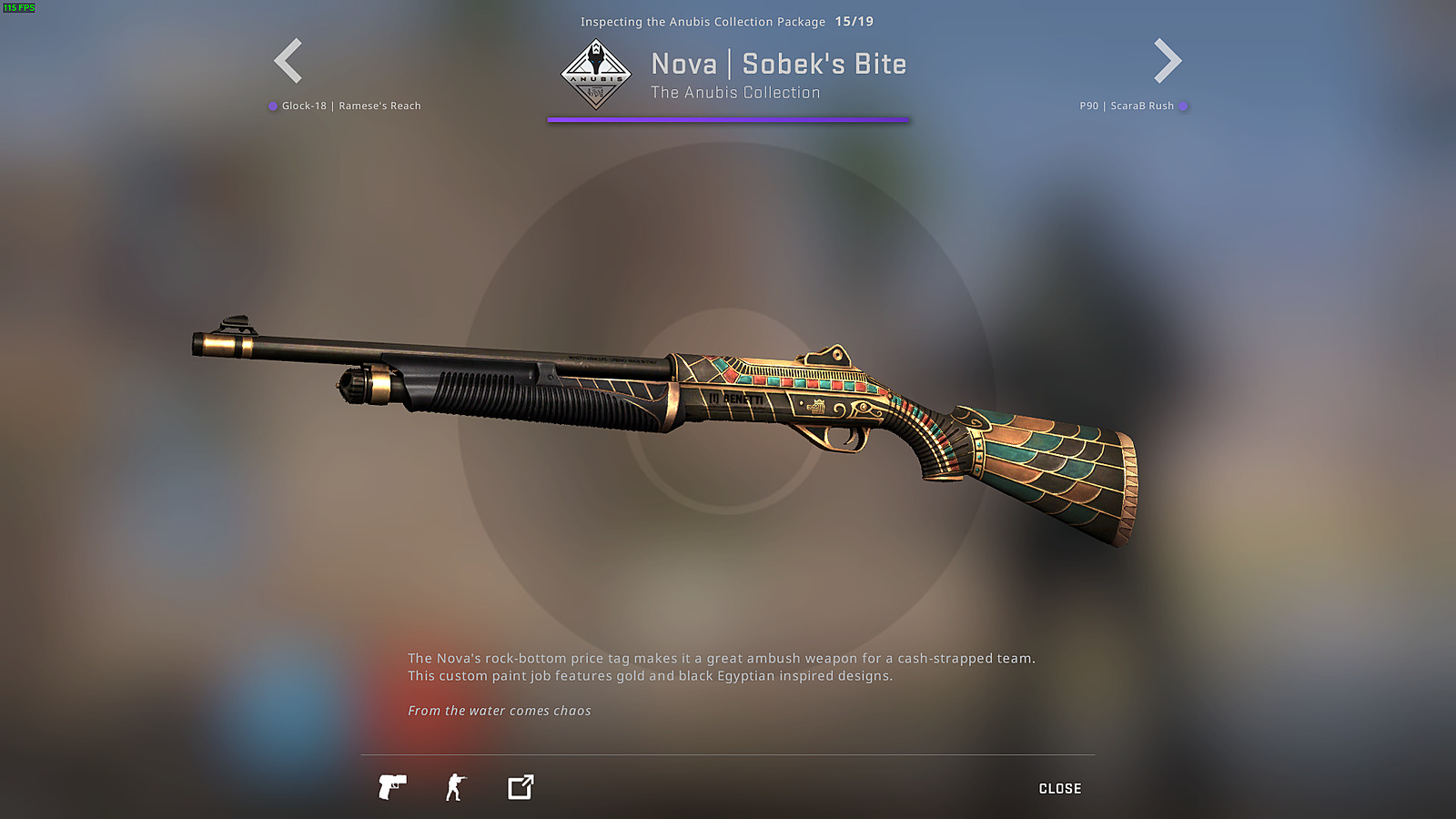 Nova Sobek’s Bite features the crocodile god Sobek’s imagery with tooth-like patterning along the forend and reptilian texturing on the stock. This skin’s aggressive thematic elements make it particularly appealing for players favoring intimidating weapon aesthetics.