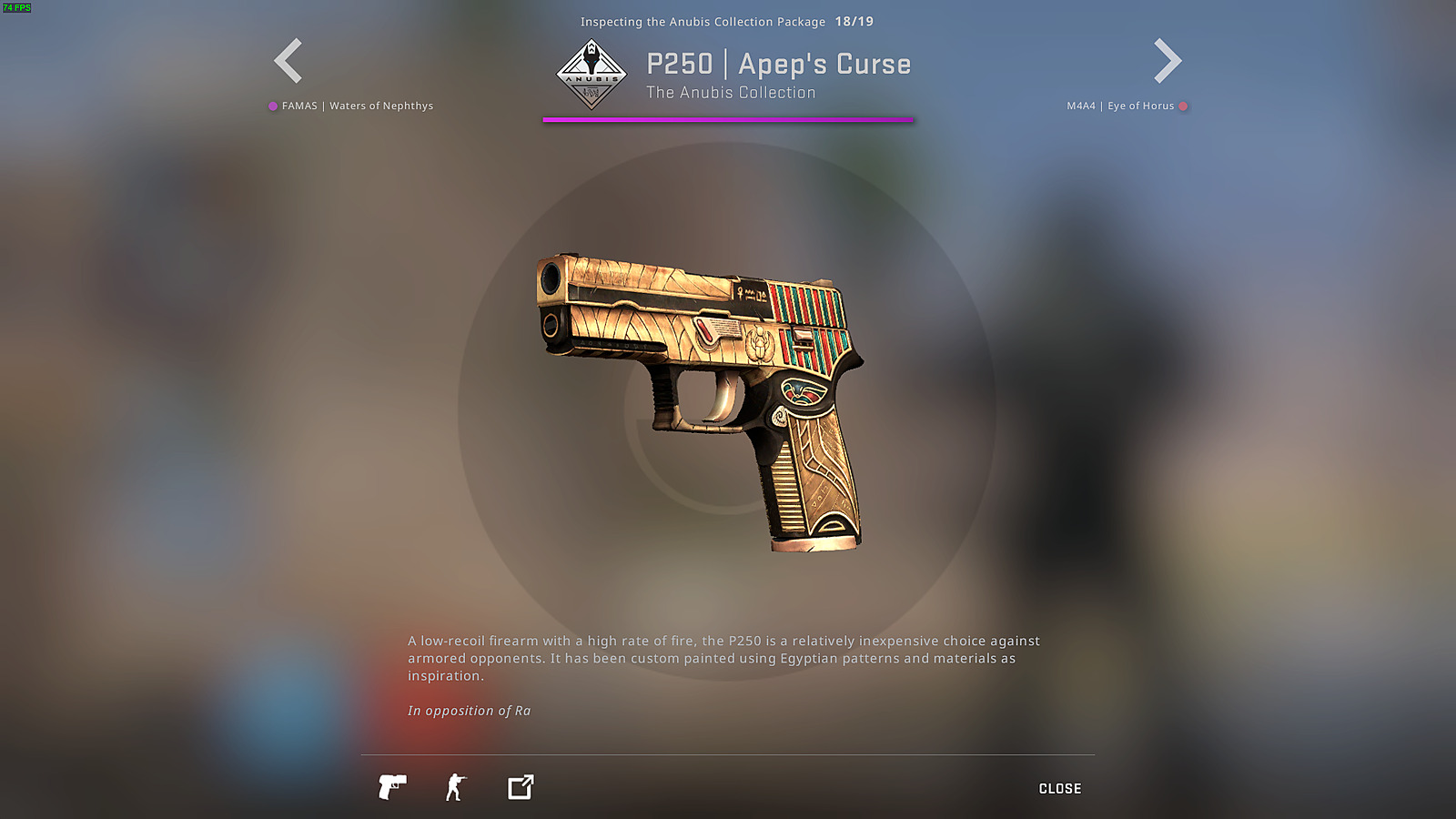 P250 Apep’s Curse embodies the chaos serpent Apep through chaotic patterning and disruptive color transitions. This skin’s aggressive aesthetic makes it particularly suitable for players seeking dramatic visual statements.