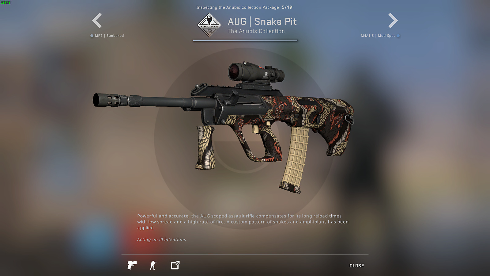 AUG Snake Pit incorporates serpent motifs and scale patterns throughout the weapon’s body. The design cleverly uses the AUG’s bullpup configuration to maximize the snake skin texture’s visual impact.