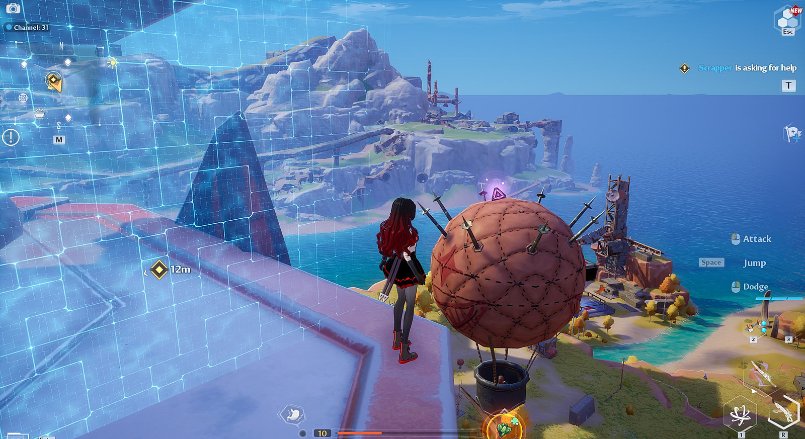 Aerial platforms provide unique access points, including one container positioned on the balloon floating above the shelter area.
