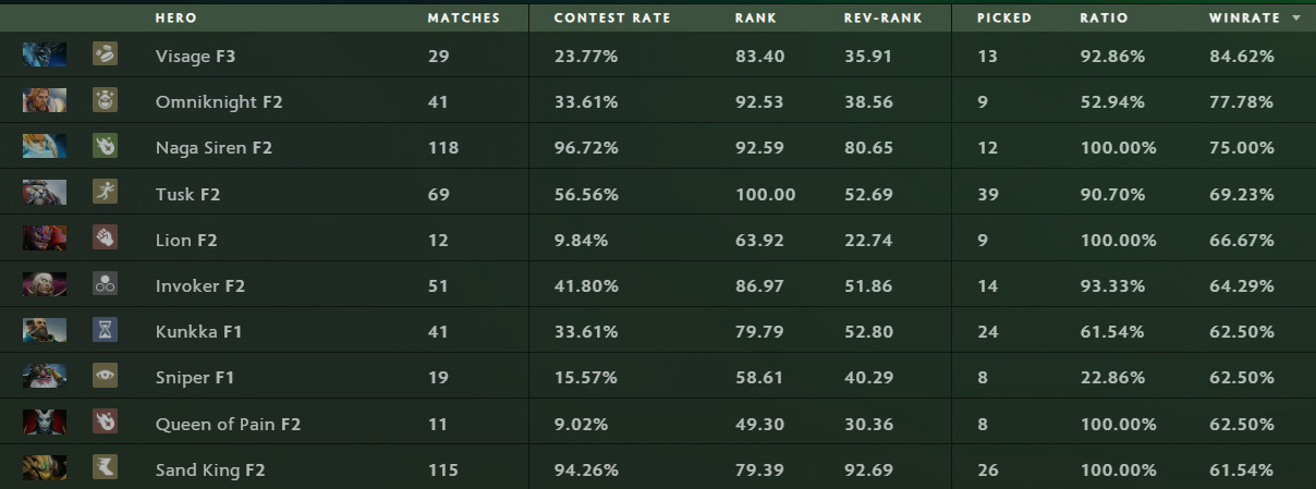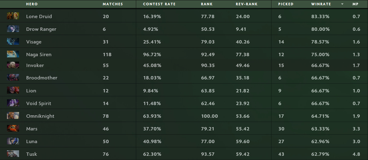 - Lone Druid achieved 83% win rate despite limited appearances
