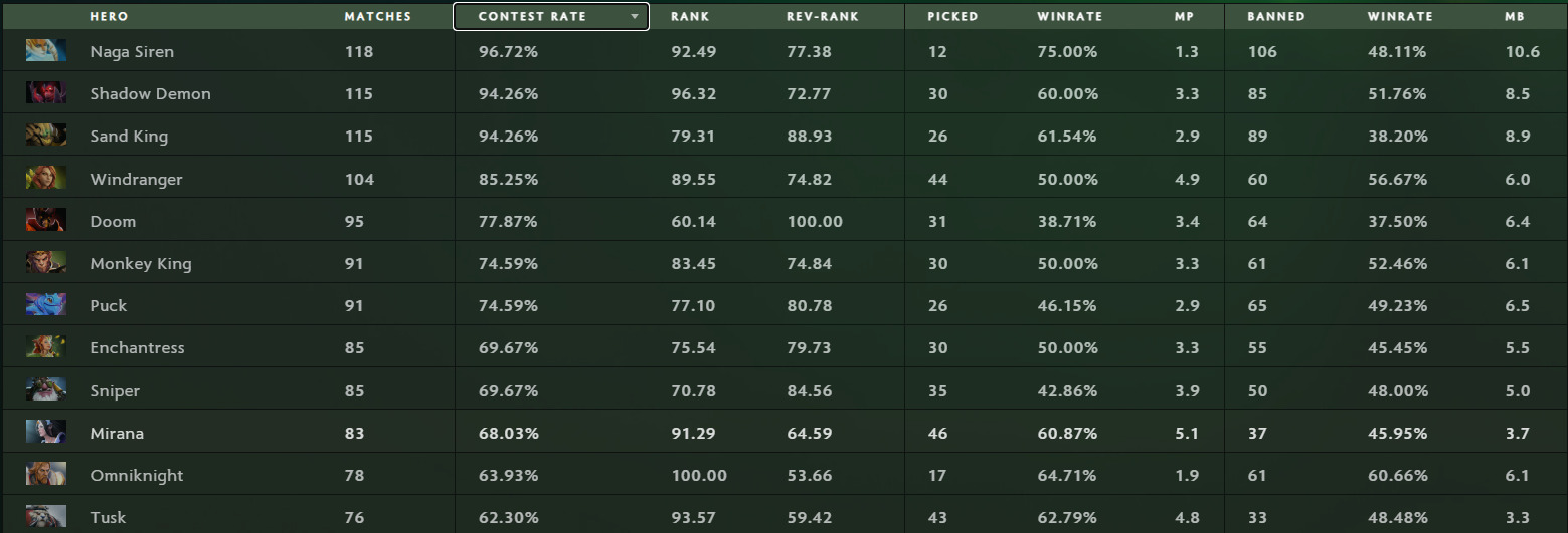 - Naga Siren was banned in 106 matches, making her the most contested hero