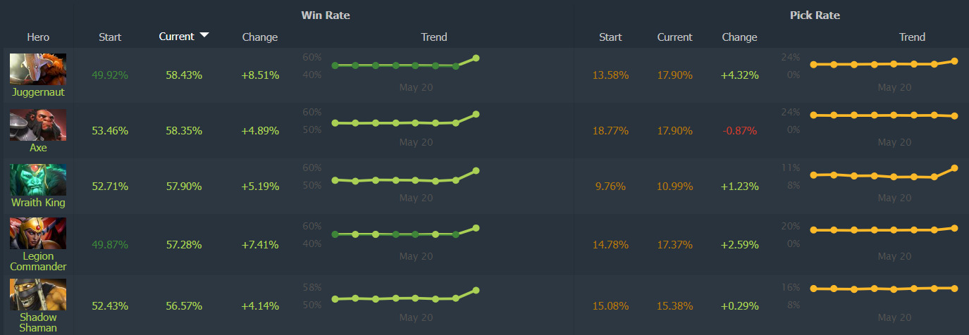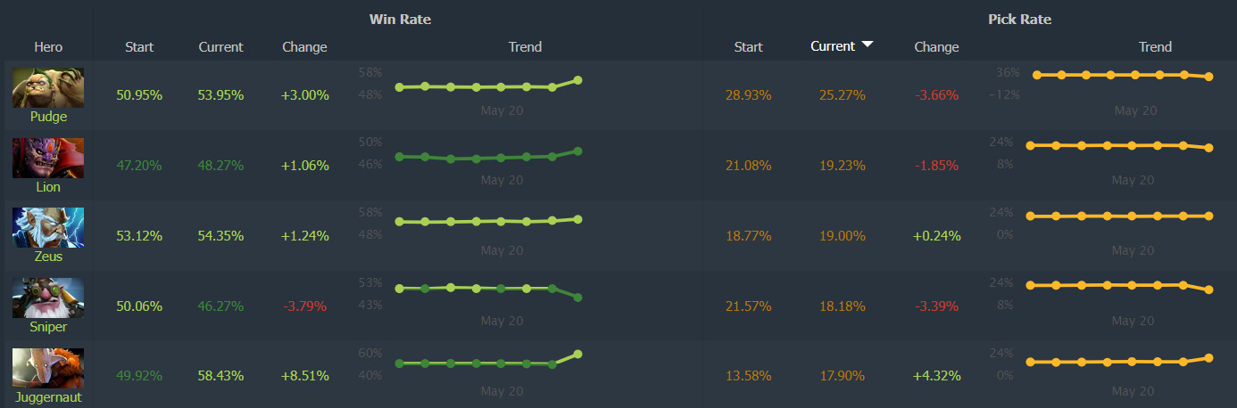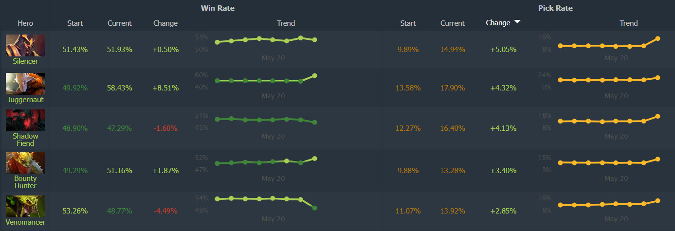 Regarding pick rate evolution, Silencer’s redesigned ability kit generates the most substantial popularity surge. Juggernaut, Shadow Fiend, and Bounty Hunter also demonstrate increased selection rates during the initial adaptation period.