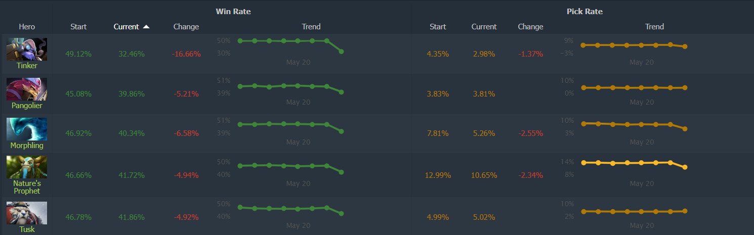 Tinker experiences the most dramatic performance collapse, plummeting to the lowest win rate with a devastating -16.66% decline. This intelligence-based hero struggles with adjusted ability timings and reduced burst damage potential against fortified targets. Additional underperformers include Pangolier, Morphling, Nature’s Prophet and Tusk, suggesting that highly mobile, skill-dependent heroes face adaptation challenges in the current environment.