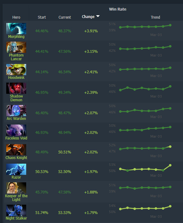 Several agility carries including Morphling and Phantom Lancer demonstrate the most substantial winrate improvements this update cycle. However, most of these increases haven’t been sufficient to elevate them beyond negative territory. Chaos Knight represents the most intriguing case, transitioning from underperformer to viable option without receiving any direct balance adjustments, suggesting meta shifts benefit his kit.