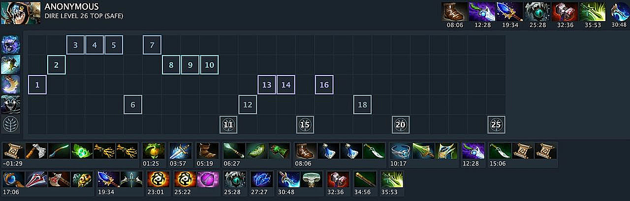 Skill build consistency defines Slark’s early game, with most players allocating one point each to Dark Pact (W) and Shadow Dance (E) before maximizing Pounce (Q). This progression maximizes mobility and control while maintaining essential defensive capabilities.
