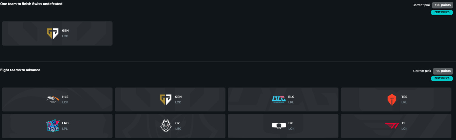 Accessing the Pick’Em system occurs exclusively through the designated LoL Esports portal. The interface displays all 16 qualified teams, requiring selection of 8 predicted advancement candidates. After confirming these choices, the interface prompts identification of one squad projected to achieve a flawless 3-0 undefeated run through the Swiss Stage.