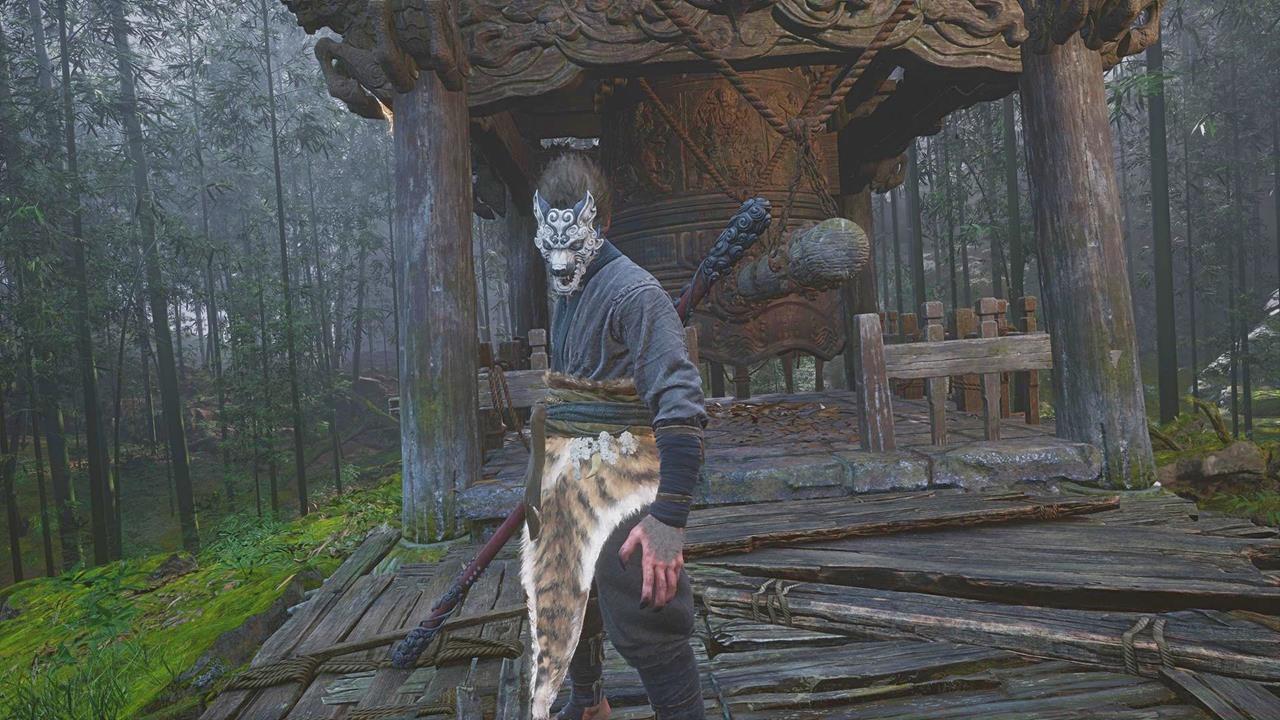 Forest of Wolves: Outside the Forest – Navigate the ascending trail up the mountainous slope until discovering a deserted clearing. Upon entry, you’ll face Guangzhi, an aggressive boss who guards the initial bell. Vanquishing this opponent rewards your first transformation spell, a crucial combat ability. The bronze bell rests at the rear section of this arena.