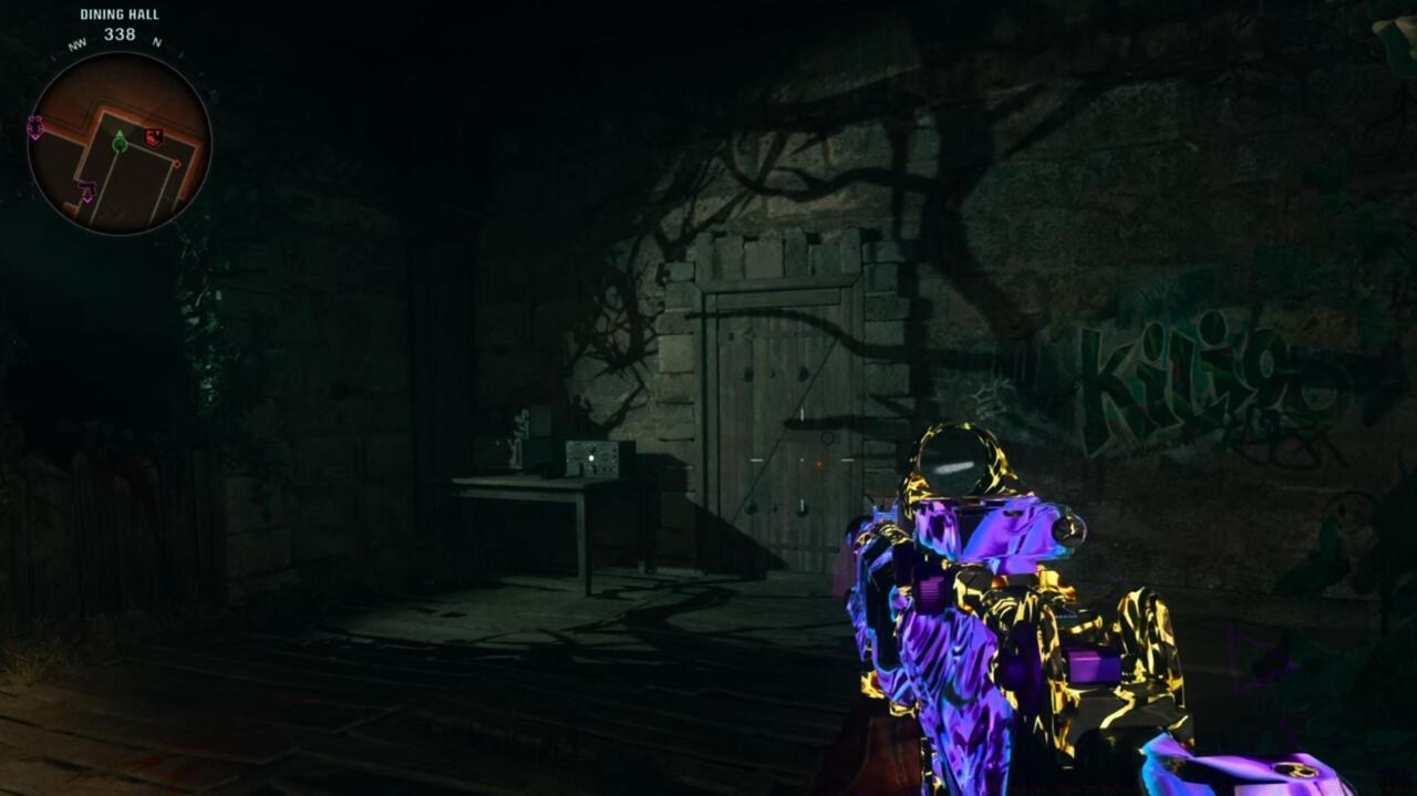 The Easter egg initiation sequence becomes available only after completing round 11. During rounds 12 or beyond, preserve one zombie while proceeding to the Dining Hall location, identifiable by the presence of the Vulture Aid enhancement station.