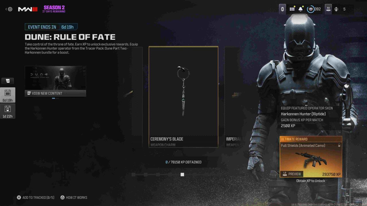 The limited-time Dune: Rule of Fate crossover has arrived in Call of Duty: Modern Warfare 3 and Warzone as part of Season 2 Reloaded, presenting players with another exclusive opportunity to collect Dune-inspired cosmetic items and progression rewards. This event introduces a tiered XP-based unlocking system where players earn distinctive cosmetics including the ceremonial Ceremony’s Blade weapon charm, the prestigious House Corrino faction emblem, and the highly sought-after Full Shields weapon camouflage. Our comprehensive breakdown covers every available reward alongside strategic approaches to maximize your XP gains efficiently.