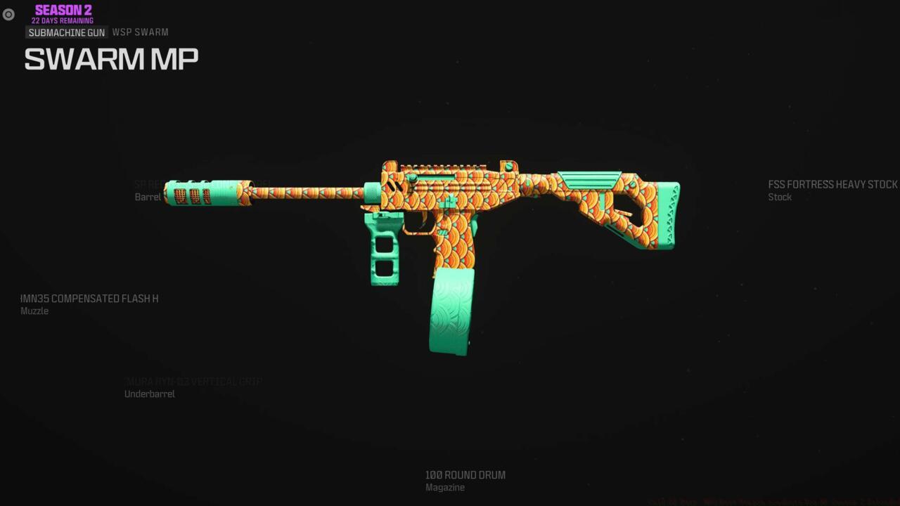 The WSP Swarm submachine gun dominates close-quarter combat with its exceptional fire rate and mobility. This configuration maximizes movement speed while maintaining control during aggressive pushes.
