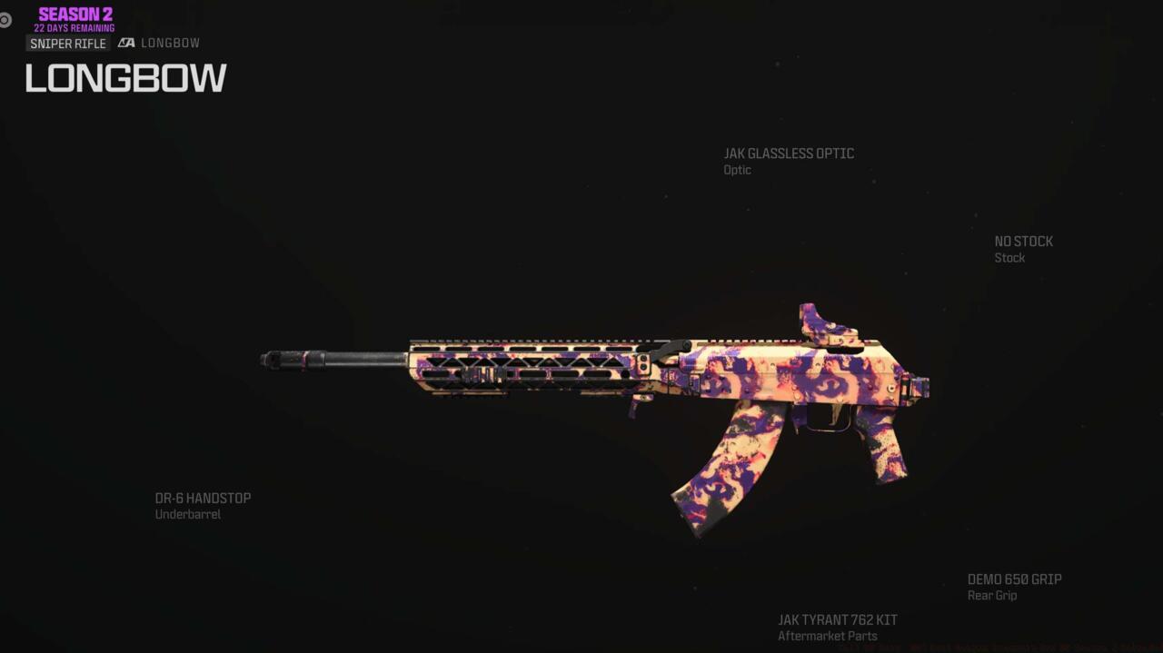 The Longbow sniper rifle delivers consistent one-shot eliminations with proper positioning. This build emphasizes stability and aim-down-sights speed for quick scoping effectiveness.