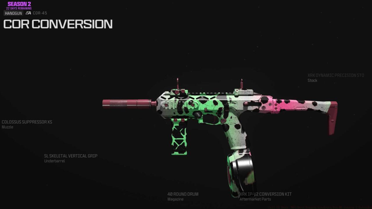 The COR-45 pistol receives significant enhancement through conversion kits, transforming it into a viable primary weapon alternative for specific combat scenarios.