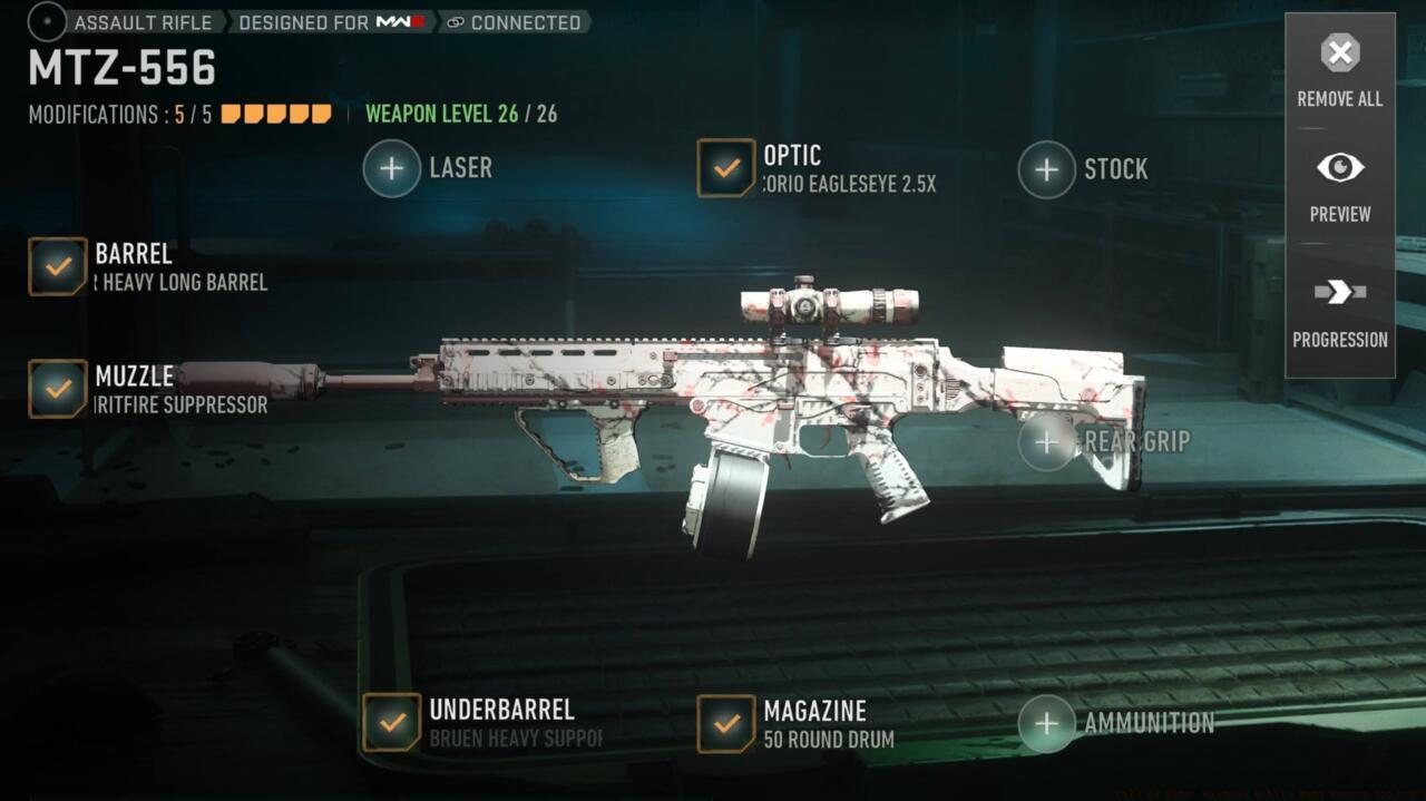 - Configure MTZ-556 with recommended attachments for foundational assault rifle proficiency