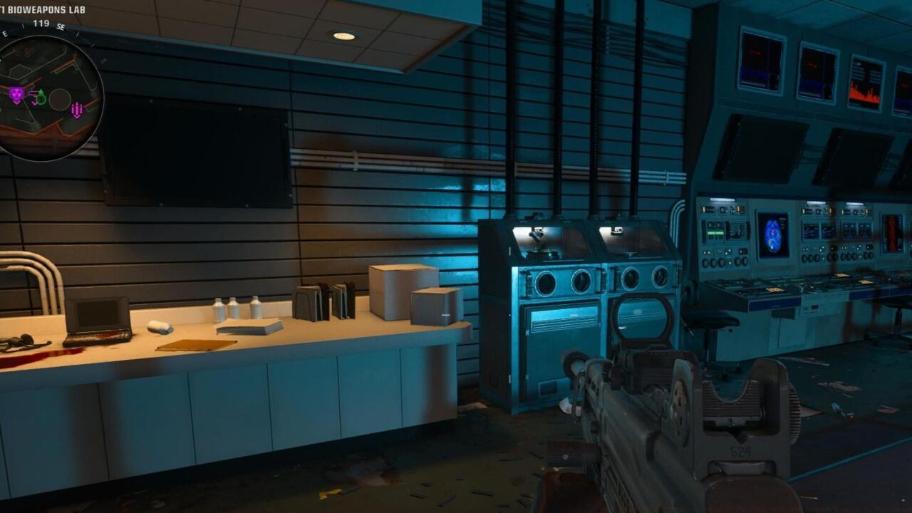 Beginning from the spawn location, proceed through the elevator on your right, transporting you directly to the T1 Mutant Research Lab facility. Within this research area, locate the computer terminal positioned adjacent to the Deadshot Daiquiri perk distribution machine.