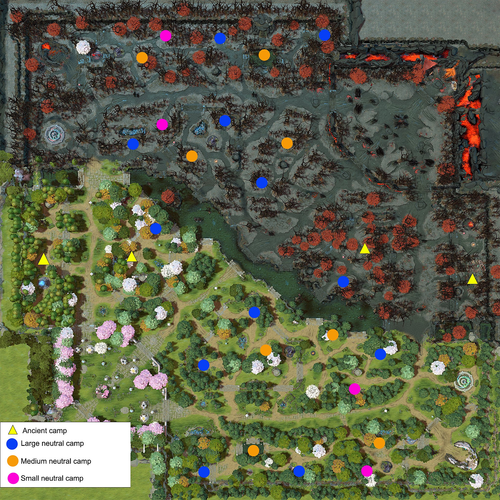 The 12 additional neutral camps are strategically positioned to create new farming patterns and jungle routes. These camps are distributed across both the Radiant and Dire territories, with several located in the expanded northwestern and southeastern regions that were previously inaccessible. Each new camp placement considers balance between the factions while offering fresh tactical opportunities.