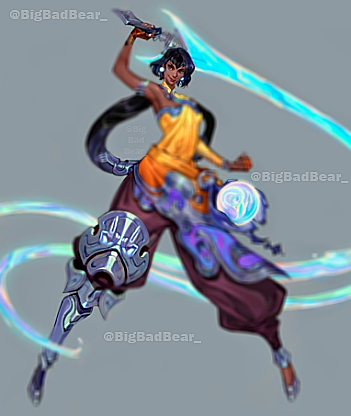 On June 11, BigBadBear presented an unauthorized visual representation. Nilah wields an aqueous lash instrument alongside an illuminated sphere corresponding to previously leaked emblem coloration. Her visual aesthetic suggests Middle Eastern inspiration, potentially validating her nominal etymology.