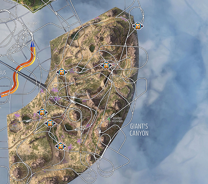 Giant’s Canyon features expansive open spaces combined with intricate canyon networks, creating diverse balloon placement scenarios. Several balloons hover above canyon rims or within narrow passages that demand precise vehicle control. The region’s scale means efficient route planning is essential to avoid backtracking.
