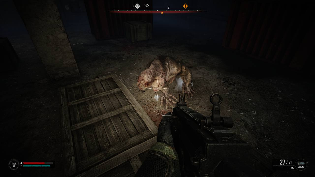 Round 2 Combat Protocol: Transition to solo combat against canine threats including one psychic variant. Critical engagement sequence: eliminate standard dogs before engaging the psy-dog. Limited armament (shotgun and sidearm) necessitates tactical positioning—ascend container stacks to gain elevation advantage and control engagement distance.