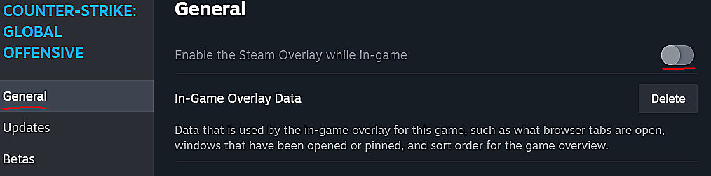 Navigate to “Library,” secondary-click your CS2 application, and select “Properties.” Within the “General” section, locate the topmost setting. Disable “Enable the Steam Overlay while in-game”. The indicator should transition from active blue to inactive grey, as illustrated in the following image.