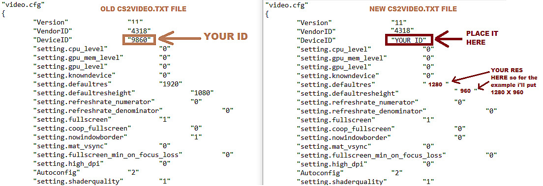 Following file replacement in CS2, extract numerical values from the “Dev1ceID” entry located in your previous cs2video.txt version. Subsequently, adjust resolution parameters as demonstrated in the accompanying visual reference.