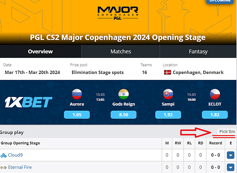 - Navigate to the tournament section on HLTV: Opening Stage, Elimination Stage. (Note: the second tournament phase currently lacks active Pick’Em functionality)