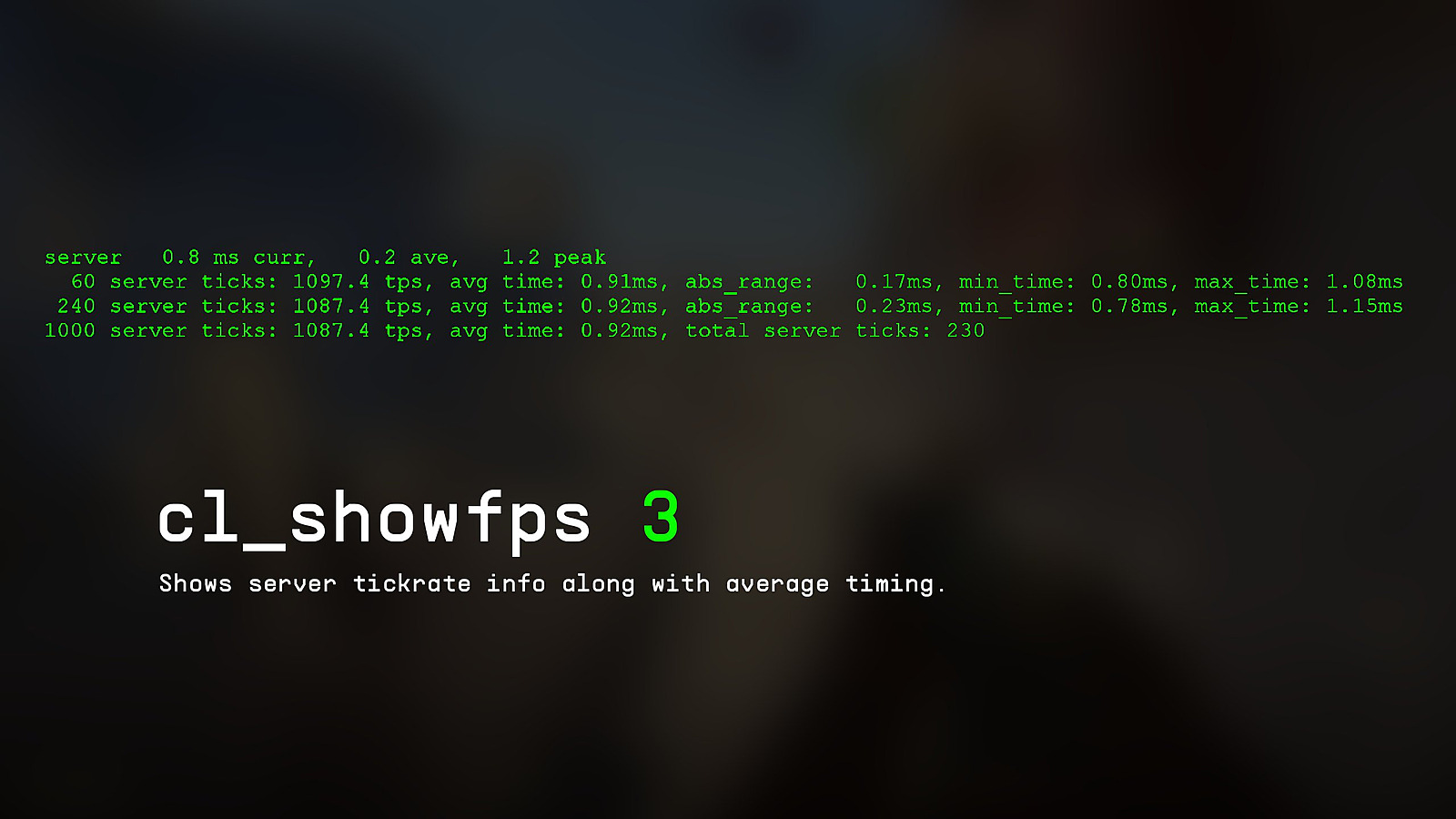 cl_showfps 3 — This advanced mode reveals server tick rate information and average timing statistics
