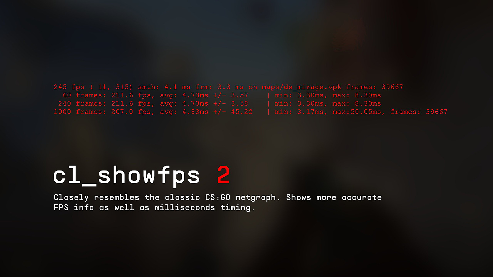 cl_showfps 2 — Functions similarly to the standard CS:GO command but offers superior accuracy: displays more precise FPS measurements and millisecond-level timing data