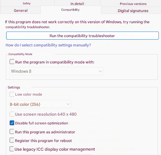 - Select the Compatibility settings tab, activate the “Disable Fullscreen Optimization” checkbox, and preserve these configuration changes