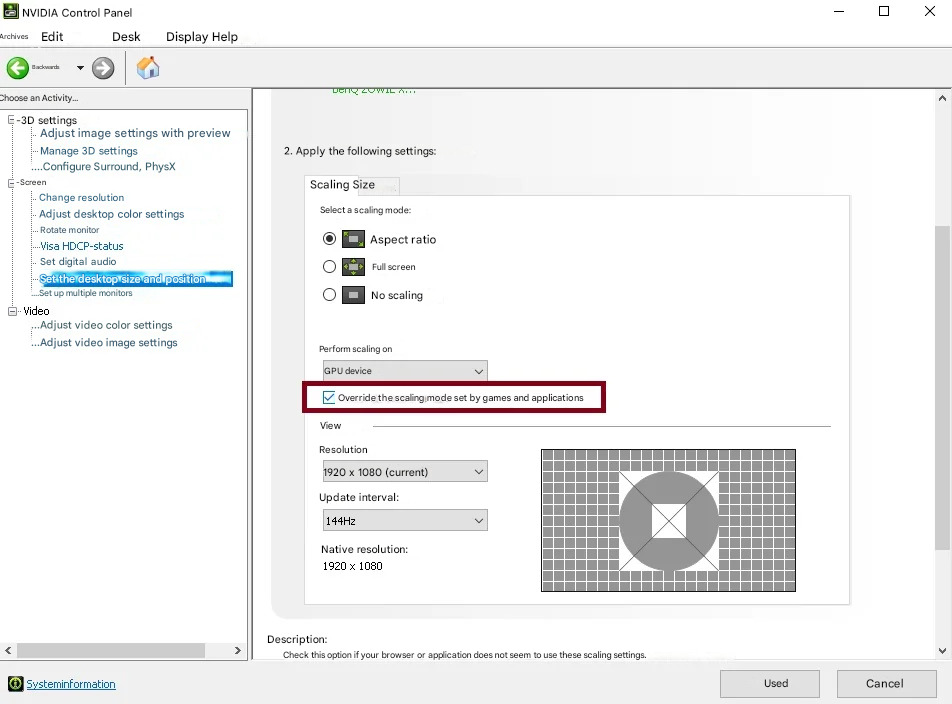 - Adjust NVIDIA control panel scaling settings as shown in reference images