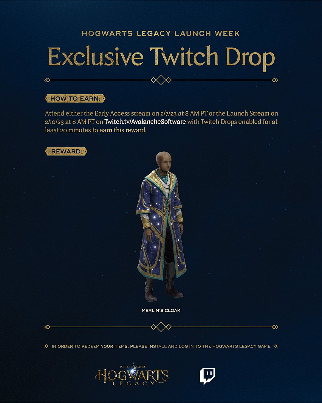 - Watch official Avalanche Software streams for exclusive Merlin’s Cloak reward