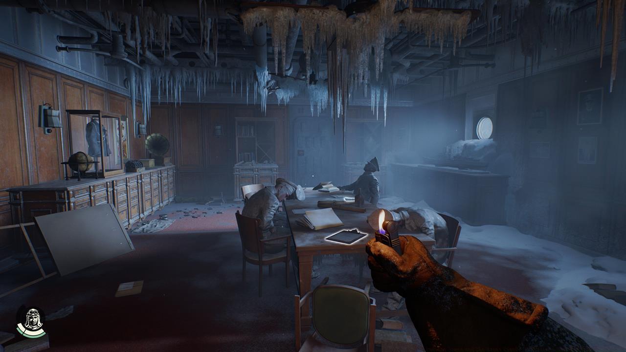 The puzzle unfolds within an officer’s dining area where the crew has met a frigid fate. To advance through this section, you must decipher an encoded mechanism that guards a sealed metal doorway. The solution requires careful observation and methodical clue collection from the surrounding environment.