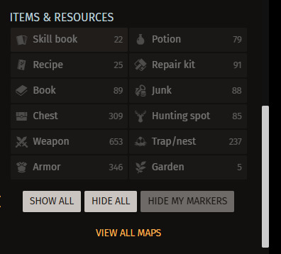 These digital cartographic tools provide exceptional detail and sophisticated categorization capabilities for various location types. The interface includes marked positions for concealed stashes, weapon and armor caches, significant non-player characters, skill training experts, alchemical supplies, and even avian nesting locations. To activate or deactivate specific category displays, navigate the vertical control panel on the interface’s left side to its lowest position. This systematic approach enables selective visualization of precisely targeted resource types while minimizing visual clutter.