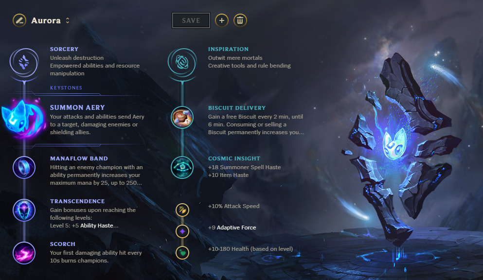Aurora accommodates two primary rune configurations effectively: Electrocute for burst-oriented playstyles and Summon Aery for sustained pressure approaches. The Electrocute path delivers superior burst damage potential for securing kills, while Summon Aery enhances survivability through additional shielding and consistent damage application.