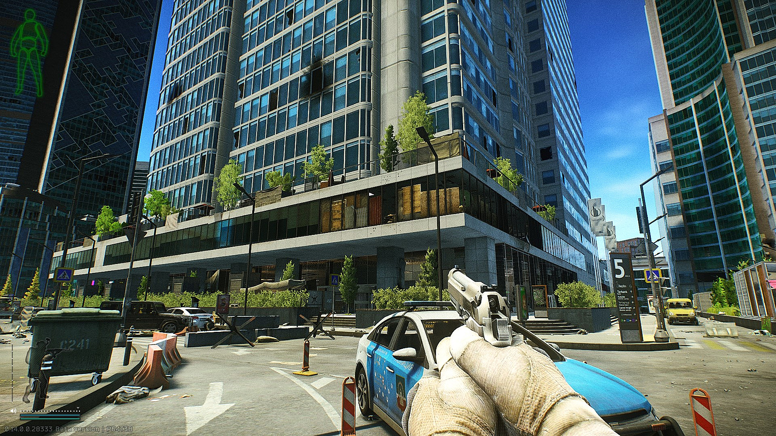 The second heavy weapon system, the Utyos machine gun, resides within the Tarbank financial district’s Empire building complex, adjacent to the heavily fortified Terragroup headquarters. This defensive emplacement targets the primary parking facility and main entrance to the secure compound, creating a natural chokepoint.