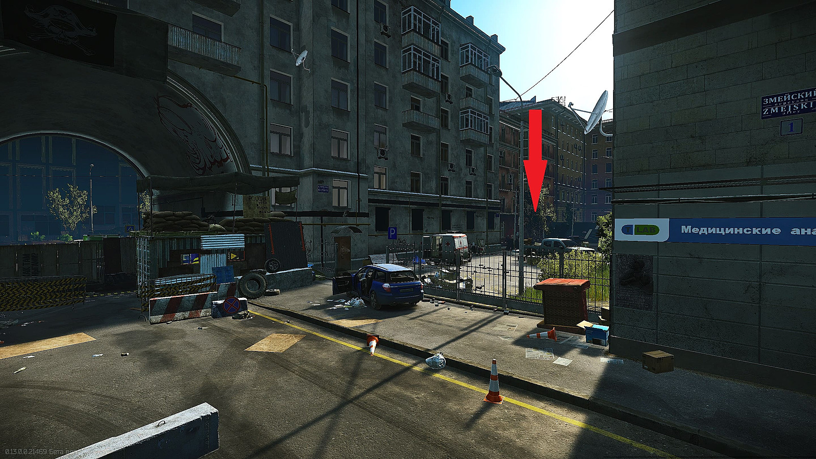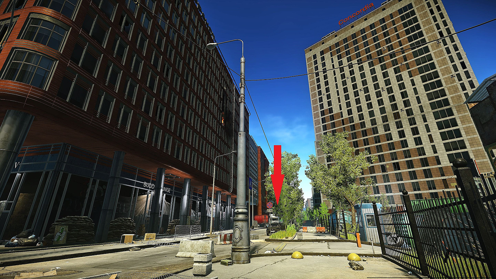 Southwestern extraction point along Razvedchikov Street adjacent to Concordia complex. Navigate to roadblock barriers marked with distinctive “EVAC” signage, offering moderate protection but predictable enemy engagement angles.